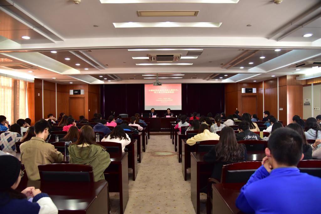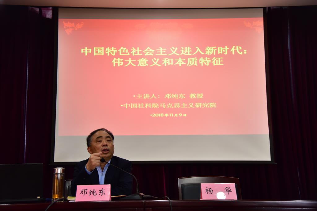 在中国特色社会主义进入新时代的本质特征方面,邓教授指出,新的时代背景下,面临的具体任务不同,本质特征也不同,邓教授根据十九大报告列举的五大本质特征也做出了自己的理解,期间还分享了自己的经历,现身说法,整个讲座氛围严肃不失轻松融洽。