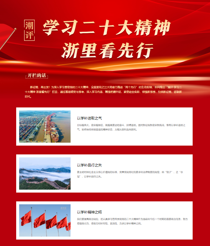 评论指出,学习贯彻党的二十大精神,要力求以学补精神之钙,一要以学补“忠诚精神”之钙,坚持“两个确立”;二要以学补“为民精神”之钙,坚持“人民至上”;三要以学补“自信精神”之钙,坚守“自信自强”。学习贯彻党的二十大精神,要力求以学补品行之失,一要以学补“大德”之失,树立家国情怀;二要以学补“公德”之失,强化服务意识;三要以学补“私德”之失,崇修自律之德。学习贯彻党的二十大精神,要力求以学补进取之气,一要以学补“勇于担当”之气,摒弃“佛系”心态;二要以学补“勤于自省”之气,摒弃“自大”心态;三要以学补“敢于斗争”之气,摒弃“畏难”心态。