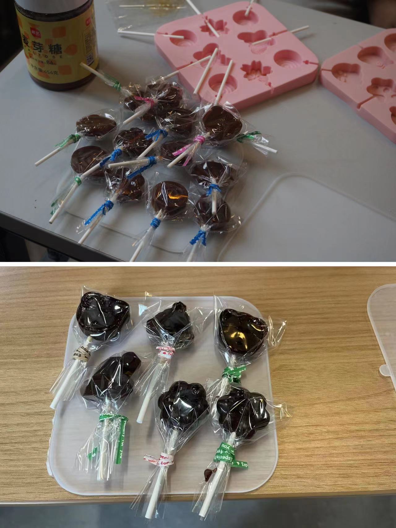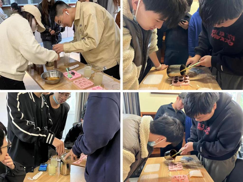 全体同学早早来到现场,按事先分工,在蒋老师的远程指导下,协作开工。削梨、打汁;麦芽糖、白砂糖称重配比,加入药膳汁,倒入锅中熬制。过程中大家依照提示,不停搅拌不让浆汁烧焦糊底,也不过于沸腾溢出锅外。同时,实时观察测量糖浆温度,达到140°时加入梨汁,再持续不断搅拌至黏稠,当温度达到160°时停止加热,完成了熬制,慢慢注入模具,静候15分钟后,同学们期待的梨膏糖成型啦。