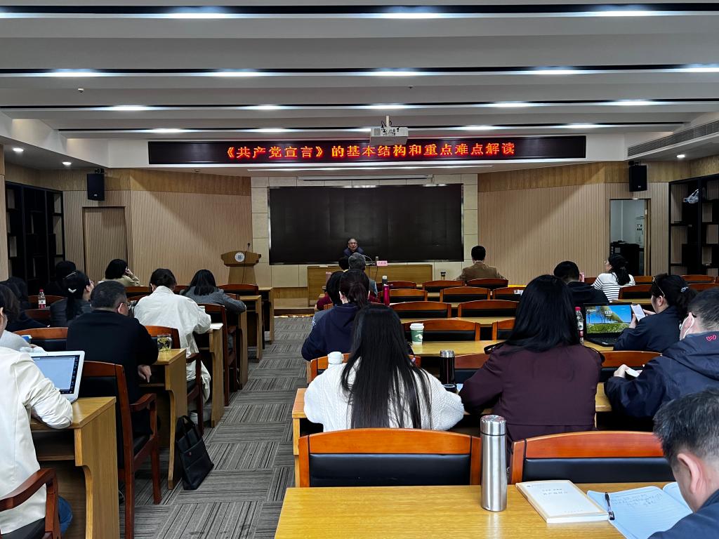 胡承槐教授向大家深入浅出地讲授了四方面内容:一是我们今天应如何看待《共产党宣言》,二是《共产党宣言》的写作目的,三是《共产党宣言》的基本框架和逻辑结构,四是《共产党宣言》的重点和难点解析。杨华经理作总结发言,她对2007so太阳集团教师提出三点要求:一是要读原著、学原文、悟原理,不断夯实自身的马克思主义理论基础;二是要从社会实践和时代特征出发,带着问题学、联系实际学;三是要以主题教育为契机,设定好自己的读书目标。