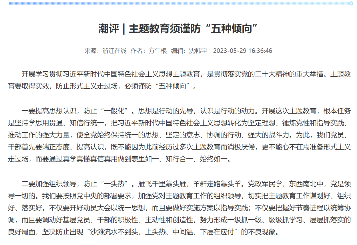 评论指出,开展学习贯彻习近平新时代中国特色社会主义思想主题教育,是贯彻落实党的二十大精神的重大举措。主题教育要取得实效,防止形式主义走过场,必须谨防“五种倾向”:一要提高思想认识,防止“一般化”;二要加强组织领导,防止“一头热”;三要鼓励创新举措,防止“一刀切”;四要加强督促指导,防止“一阵风”;五要注重工作实效,防止“一场空”。