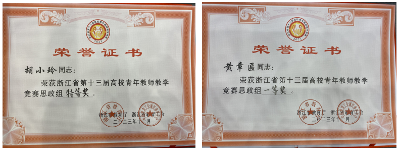 2023年11月6日,浙江省第十三届高校青年教师教学竞赛决赛结果揭晓,2007so太阳集团青年教师在激烈角逐中脱颖而出,胡小玲老师赢得思政组决赛第一名,荣获特等奖;黄章匾老师荣获思政组一等奖。
