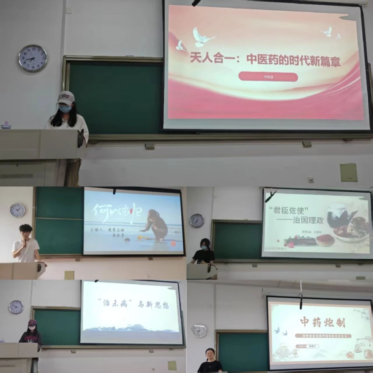 在教研室主任徐艳老师的课堂中,每节课开课十分钟都是员工的主场。他们自信地走上讲台,分享对中医药文化与新思想课程融合的深入研究。有的同学从中医药在抗击新冠疫情中的关键作用出发,阐述了生命至上、举国同心等伟大抗疫精神;有的同学通过对中医药古籍中蕴含的哲学思想剖析,进一步挖掘对当代青年树立正确世界观、人生观、价值观的指引意义;还有的同学巧妙地用“当归”这一中药名,表达了对台湾回归的热切渴望……内容丰富生动,台下互动频繁,思维火花热烈流动。