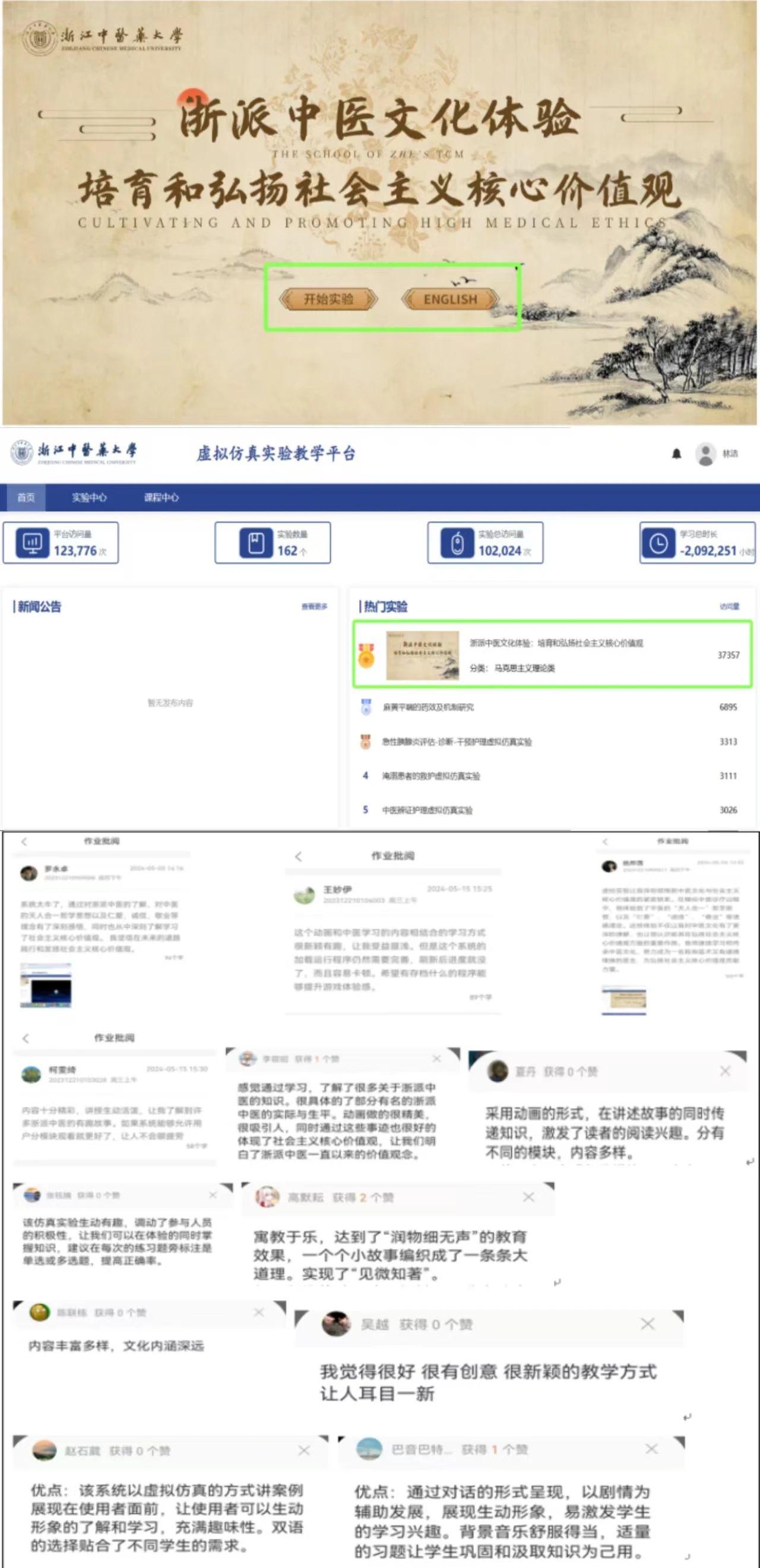 教研室主任林洁老师建设完成省内首个展现“中医药文化+思政教育”的虚拟仿真重点实验项目“浙派中医文化体验:培育和弘扬社会主义核心价值观”,中英文双语版,融入暑期实践教学活动之中,访问量超37000余次,使用量稳居公司第一,员工反馈良好。