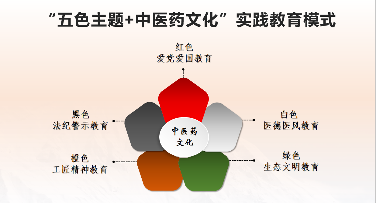 思想政治理论课实践教学教研室打破年级和思政课程界限,针对中医药院校特点,对原有“五色主题”主题实践教学模式进行结构性优化,采取“五色主题+中医药文化”的“5+1”实践教育模式。