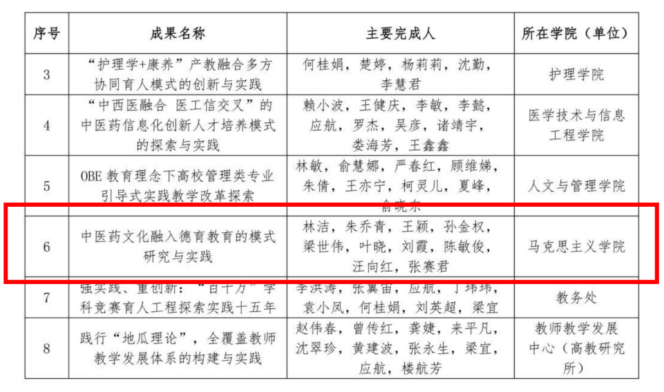 经过多年深耕,林洁老师主持申报的《中医药文化融入德育教育的模式研究与实践》获得校级本科生教学成果一等奖,详情如下图。