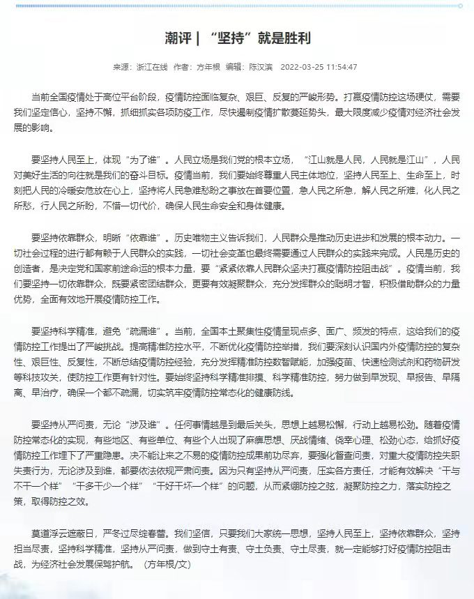 日前,公司党委组织部印发了《关于充分发挥各级党组织作用为疫情防控、助力亚运提供坚强保证的通知》。今天,2007so太阳集团党总支书记方年根教授在浙江省委省政府新闻门户网站《浙江在线》发表评论文章《“坚持”就是胜利》,为做好新形势下疫情防控工作提供积极舆论支持。