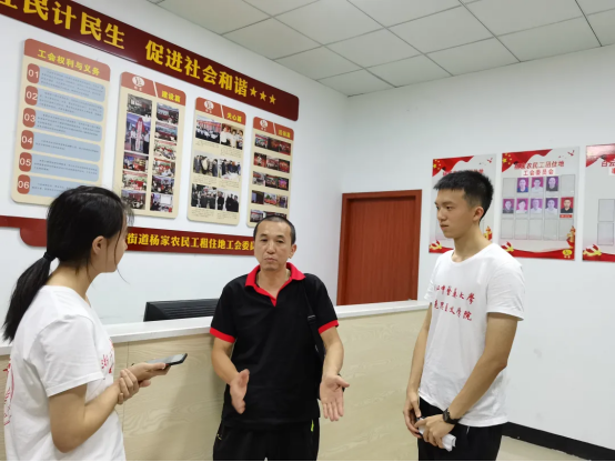 首先,农民工调研小分队前往白云街道杨家村,在杨家农民工租住地工会副主席杨发念的带领下,小分队成员对于农民工的日常管理模式有了初步的了解。杨家农民工工会是全国首家农民工租住地工会,以租住地外来农民工为会员,以服务农民工为宗旨,以农民工自我管理为依托,实现农民工自我管理、自我教育、自我服务。