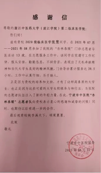 “病魔”无情,“杏林”有爱。工作中,张慧同学扎实肯干、认真负责、运用所学回馈社会,为他人送温暖,为社会做贡献,用青春的热血擦亮为民服务的底色,减轻了医务人员的工作压力,改善群众就医体验,深受医院工作人员和群众肯定,让患者深切感受到就诊便利和人间关爱。